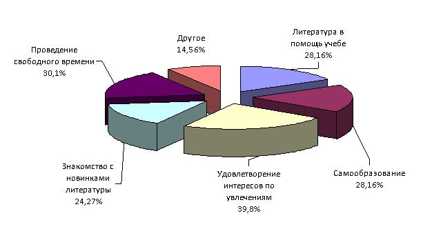 Самыми актуальными стали вопросы, связанные с формированием любви к книге и литературных предпочтений. Так 81,55% опрошенных считают библиотеку источником информаций и знаний, 36,89% - храмом культуры и 15,53% ответили, что для них она является центром межличностных отношений. Среди причин прихода в библиотеку лидирует – «удовлетворение интересов по увлечениям» – 39,8%. Большинство респондентов указало более одной причины.